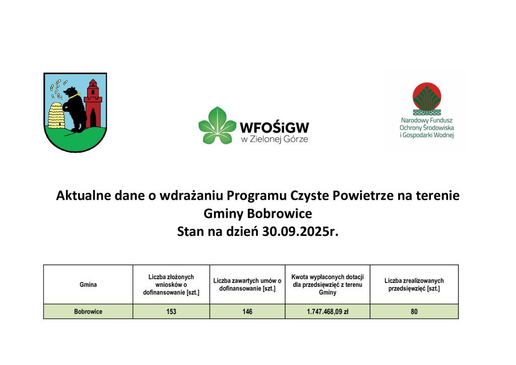 Od 1 czerwca 2021r. na terenie Gminy Bobrowice działa punkt konsultacyjno-informacyjny programu Czyste Powietrze.